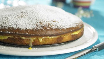 Flæk kagen på midten og lad den afkøle på en rist. Pisk smør og flormelis lyst og skummende. Tilsæt æggeblommen, reven appelsinskal og appelsinsaft og rør det godt sammen. Smør cremen på den nederste del af kagen, læg den øverste del over og server.
