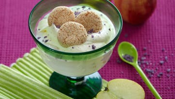 Pisk æggehviderne stive, pisk æblegrøden i og pisk endnu et par min. Pisk æggeblommer, sukker og vanilje til en luftig æggesnaps, pisk fløden til skum og vend den i æggesnapsen. Fordel makroner i bunden af 6 portionsglas, dryp med lidt portvin og kom æblemassen over. Fordel cremen over æblemassen, pynt med lidt makroner og kandiserede violer.