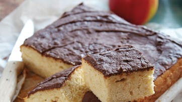 Pisk æg, sukker og vaniljesukker lyst, bland mel og bagepulver og vend det i sammen med olie og mælk. Riv æblet og vend det i dejen. Kom dejen i en 20 x 20 cm form beklædt med bagepapir og bag den i 35 min. ved 200°. Læg pålægschokolade over den varme kage, lad den smelte og glat den let ud med en kniv.