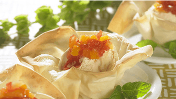 Fyld: Tag kernerne ud af tomaterne og skær dem samt abrikoser i meget små tern. Kog tomater og abrikoser med sukker under låg ved svag varme ca. 5 min. Rør rundt nogle gange. Lad det køle og smag til med likør. Læg iskugler i fillokurvene og kom kompot over.