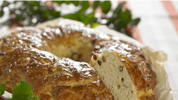 Rør gær og mælk glat. Tilsæt æg, salt, sukker, smør og appelsinskal og -saft samt tørret frugt. Kom melet i, gem lidt til senere, og ælt dejen glat, men ikke for fast. Lad den hæve lunt tildækket i skålen 2 timer. Slå dejen igennem med en ske. Tegn en cirkel efter en middagstallerken på bagepapir. Vend papiret. Form den bløde dej til en krans efter den tegnede cirkel, og læg mandlerne på. Efterhæver 1 time på pladen. Pensl med æg, og drys sukker på. Bag kransen 20-25 min. ved 200° på nederste rille, til den er gylden. Spis kransen nybagt og lun.