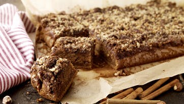 Blend frugten med saften og bland mel, sukker, natron og salt. Rør melblandingen med frugten, rør æggene i og hæld dejen i en 25 x 35 cm bradepande beklædt med bagepapir. Drys farin, kanel og nødder over dejen og bag kagen ved 175° i 50 min. Server kagen som den er eller med lidt cremefraiche eller flødeskum.
