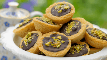 Bag små, lækre kager til kaffen, pyntet med mørk chokolade og pistacienødder
