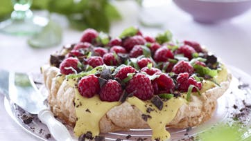 Marengs: Pisk hviderne stive. Tilsæt citron og sukker lidt ad gangen og pisk, til skummet er hvidt og fast. Vend nødderne i. Sæt et stykke bagepapir fast i bunden af en springform. Pensl papiret og formens kant med smeltet smør. Hæld marengsdejen i formen og bag den ca. 30 min. ved 160° i den nederste del af ovnen. Køl bunden af og tag den ud af formen. Bred cremen over. Læg hindbærrene drysset med chokolade på cremen. Pynt evt. med mynte.
