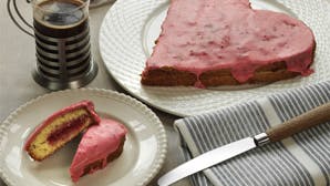 Pisk æg og sukker i 10 min. Riv marcipanen fint og rør i. Fold hvedemel i sammen med citronskal og saft. Fordel i smurte hjerteformede kageforme (eller en stor) og bag enten i 10 min. ved 200° i små forme og 40 min. ved 180° i en stor. Flækkes, når den er kold og smøres med mosede hindbær rørt med sukker efter smag. Lidt af væden, der trænger ud, gemmes og røres i flormelis, så glasuren bliver rød. Overtrækkes med denne og drysses med glimmer.
