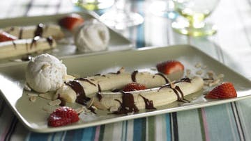 Pil bananer og split dem på langs. Anret på tallerkner og læg en kugle is over. Drys med mandler og chokoladesovs og pynt med jordbær.