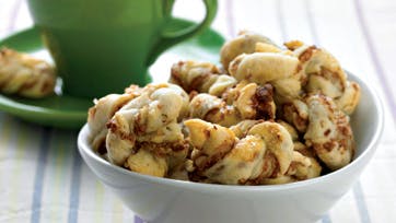 Del butterdejen i to plader og bland nougat og marcipan til en blød, ensartet masse. Hak hasselnødderne fint og rør dem i nougatmassen. Fordel nougatmassen på den ene butterdejsplade og læg den anden over. Rul over butterdejspladerne et par gange med en kagerulle og skær dem i strimler på 1½ x 10 cm. Sno strimlerne og bind dem sammen til en knude. Læg knuderne på en bageplade, pensl med æggehvide og drys med perlesukker. Bag knuderne ved 175° varmluft i 20 min. og lad dem afkøle.