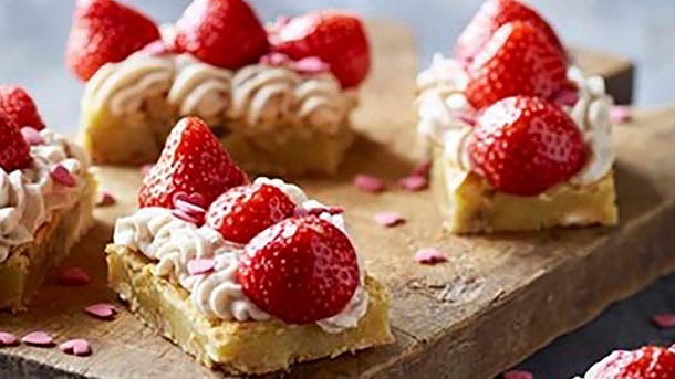Skær kagen i 12 stykker og pynt med jordbærcreme, jordbær og evt. sukkerhjerter.