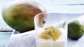 Pisk æggeblommerne hvide med sukkeret og smelt chokoladen. Bland cremefraichen i chokoladen og rør det i æggesnapsen. Pisk hviderne stive og vend dem i cremen. Fordel cremen i 4 portionsforme, der er egnet til frysning, og stil dem i fryseren i mindst 2 timer. Skræl mangoen, fjern stenen og skær den i tern. Kog mangoternene i appelsinsaften sammen med limesaft, sukker og den flækkede vaniljestang i 10 min. Tag vaniljestangen op og blend sovsen og lad den køle helt af.