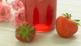 Skyl og nip jordbærrene og skær dem i mindre stykker. Læg dem i en gryde og kog op. Kog under låg ved svag varme ca. 10 min. Hæld bærrene i en saftpose eller sigte med et klæde. Lad dem dryppe af i 30-40 min. Hæld saften (ca. 2½ dl) tilbage i gryden. Rør sukker og citronsyre i og kog kraftigt 1 min. Rør melatin i og kog 1 min. Tag gryden fra varmen og skum geléen. Træk kronbladene af roserne og rør dem i. Hæld geléen i små skoldede glas og luk dem.
