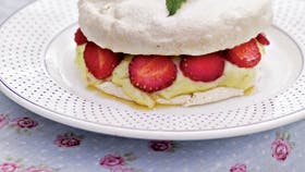 Pisk æggehviderne halvstive. Kom sukker i lidt ad gangen, til det er sejt, og fold blendede nødder i. Kom marengsmassen i små forme, så der dannes 8 mini lagkagebunde. Bages ved 150° i 35 min. Kog sammenpisket æggeblomme, mælk, sukker, vanilje og majsstivelse til det tykner til creme. Skyl jordbær og skær i halve. Læg creme på halvdelen af de afkølede bunde, læg jordbær på og læg de sidste bunde på som top. Pynt med jordbær og lidt mynte.
