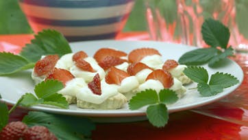 Pisk fløden til skum og pisk cremefraiche luftigt med vanilje, citron og sukker. Vend de to ting sammen, læg dem på kagerne og pynt med jordbær.