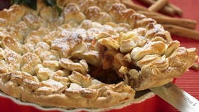 Skær æblerne i tern og bland dem med marmelade, rosiner, mandler, kanel, sukker og majsstivelse. Beklæd en smurt 24 cm tærteform med den ene dej og hæld fyldet over. Udstik hjerter af den anden dej og læg dem taglagt over fyldet. Pensl med sammenpisket æg og bag tærten ved 190° i 45-60 min.