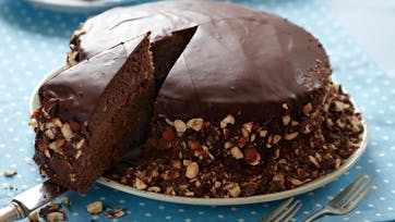 Overtræk: Hak de 150 g chokolade, kog den op med fløden og sluk. Lad chokoladen køle af og rør til en jævn creme. Hak den sidste chokolade og nødderne. Smør chokoladecremen på kagen og drys med hakket chokolade og nødder.