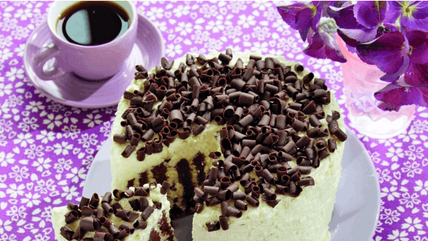 Del bunden på den lange led i 4 strimler på 7½ cm og læg dem i forlængelse af hinanden. Smør halvdelen af cremen på bundene og rul dem sammen. Stil rouladen oprejst, så spiralen kan ses oppefra. Fordel resten af cremen på kagen og drys chokoladespånerne over.