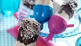 Blend yoghurt, sirup, creamed coconut og banan. Kom cremen i ispindeforme, sæt pinde i og frys dem i mindst 4 timer. Smelt chokoladen over vandbad, dyp isene i chokoladen og drys med revet kokos.