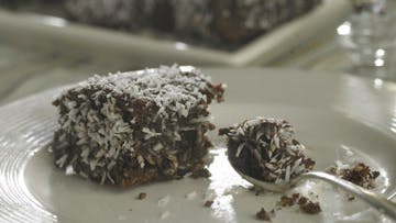 Smør en 20 x 20 cm form. Rør smør og sukker blødt. Tilsæt æggene et ad gangen og vend mel, kokosmel, kakao og bagepulver i skiftevis med mælken. Kom dejen i formen og bag den ved 180° i 20 min. Test om den er gennembagt. Smelt smør og chokolade sammen med 4 spsk. vand ved jævn varme. Pisk så flormelis i. Skær kagen i 16 firkanter, smør dem med overtrækket og vend dem i kokosmel.