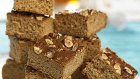 Varm siruppen og kom krydderier, så mælk og til sidst mel med bagepulver i. Dejen kommes i en bagepapirforet bradepande (25 x 35 cm) og drysses med hakkede nødder. Bages ved 180° i 30 min. Når den er kold, skæres den i klodser, som evt. drysses med sigtet flormelis.