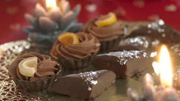 Ganache laves af fløde, som lunes med chokolade, til chokoladen er smeltet. Sættes køligt et par timer eller på køkkenbordet natten over. Ælt marcipanen med orangeskal og Grand Marnier og kom en lille teskefuld i hver chokoladeskal. Kom den piskede afkølede ganachecreme i en sprøjtetylle med smalt hoved og lav en ring på hver skålekant, så marcipanen holdes inde. Luk med appelsinskive.