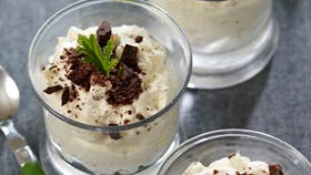 Læg husblassen i blød i koldt vand. Pisk æggehviderne stive og pisk sukkeret i. Pisk fløden stiv med limeskal og pisk sukkeret i. Tryk vandet af husblassen og smelt den ved lav varme i mikroovn eller over vandbad. Bland limesaft og husblas og rør det i flødeskummet. Vend forsigtigt hviderne og halvdelen af chokoladen i. Hæld moussen i dessertglas og stil dem koldt et par timer. Pynt med resten af chokoladen og limeskiver.