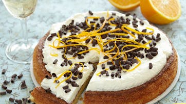 Del æggene i blommer og hvider og pisk blommerne lyse med sukkeret. Riv appelsinskallen fint og kom den i æggeblommerne sammen med mandlerne. Pisk æggehviderne stive og vend dem forsigtigt i. Kom dejen i en smurt, 26 cm springform, bag kagen ved 200° i 35 min. og lad den afkøle. Læg kagen på et serveringsfad, prik den med en gaffel og hæld saften fra appelsinen blandet med portvin over. Pisk fløden til skum, kom den over og pynt med høvlet chokolade.