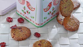 Bland mel, bagepulver, lakrids, tranebær og smør i tern i en foodprocessor. Kør, til smørret er findelt. Tilsæt sukker og æg, kør til dejen har samlet sig. Form den til 2 pølser. Pak dem i alufolie og læg dem i køleskab 2-3 timer eller længere. Skær dejen i ¾-1 cm tykke skiver og læg dem på plade med bagepapir. Bag kagerne ca. 8 min. ved 180° på midterillen og køl dem af på en bagerist.