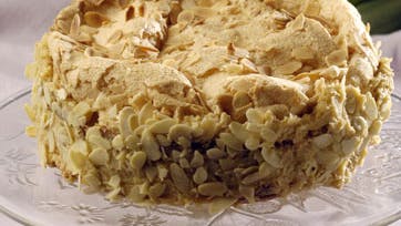 Rør smør og sukker luftigt og tilsæt æggeblommerne en ad gangen. Vend hvedemel og bagepulver i skiftevis med mælken. Kom dejen i 2 bagepapirbeklædte springforme, så det bliver til to lagkagebunde af en vis tykkelse. Pisk så marengsen af æggehvider, der først piskes halvstive og så seje med sukker. Smør marengsmassen over dejen på begge forme og drys med mandelflager. Bages ved 175° i 20-25 min., til dejen er gennembagt. Lad bundende afkøle og tag dem ud af formene. Pisk så smør med florsukker, æggeblommer og vanilje samt med kaffen udblødt i lidt kogende vand. Cremen skal være luftig. Smør 1/3 på hver af bundene, der lægges sammen med cremen opad og smøres med creme langs kanterne, som yderligere pyntes med lidt mandelflager. Spises som dessertkage med sorbet og frugter og lidt citronmelisse eller mynte.