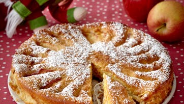 Smør en springform på 23 cm med smør og drys bunden med farin. Skær æblet i tynde både og læg dem i bunden af springformen. Bland sukker, mel og bagepulver og rør æg, mandelessens og olie i. Hæld det kogende vand i, pisk i 1 min. og hæld dejen over æblerne. Bag kagen ved 200° i 30 min. og servér den afkølet drysset med flormelis, evt. med lidt kold cremefraiche.