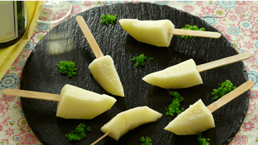 Skræl melonen, skær den i passende stykker og sæt dem på spiddene. Gnid overfladen med citron og frys dem natten over. Rør lidt grøn frugtfarve i sukkeret og servér det til melon-isene.