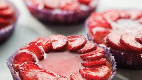 Pisk osten med sukkeret. Rør æg, cremefraiche, vaniljesukker, citronskal og saft i. Fordel flødecremen i formene og bag kagerne midt i ovnen ved 200° i 20-25 min. Sluk for oven og lad kagerne stå yderligere 10 min. i ovnen. Kog jordbærsaften op og tilsæt gelatinepulveret. Lad geléen køle af. Skær jordbærrene i skiver og læg dem i en krans på kagerne, hæld geléen over.