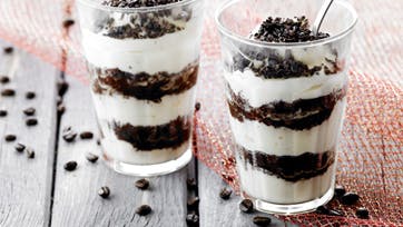 Portionsanrettet dessert med kaffe, kakaosmulder og flødeskum