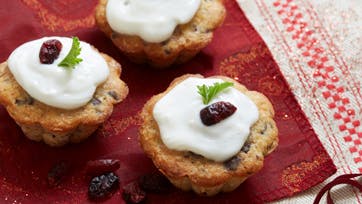 Glasur: Rør yoghurt og flormelis glat. Smør glasuren på de kolde kager. Pynt med tranebær og et lille grønt blad, vi har brugt citrongeranium.