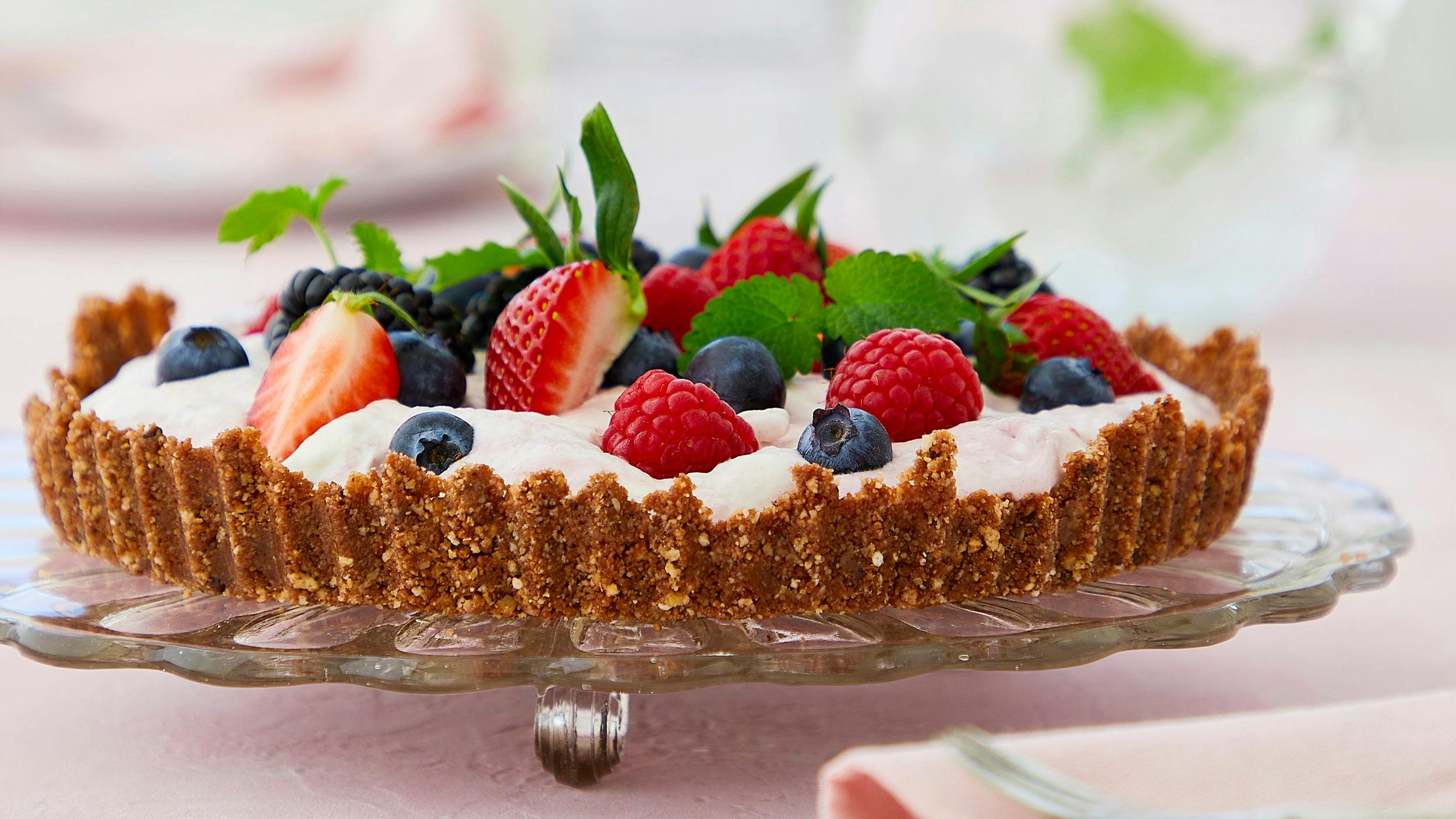 Mousse og pynt: Bland marmelade og skyr. Pisk fløden let, og vend den i lidt ad gangen. Fordel moussen oven på kiksebunden. Pynt med friske bær og citronmelisse eller mynteblade på toppen.
