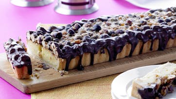 Rør mel, smør og flormelis sammen til dejen og saml med æggeblomme. Stil den koldt i 30 min. og tril dejen til en pølse der skæres i skiver på ½ cm. tykkelse. De lægges ud i bunden af en smurt tærteform, så de dækker helt. Stilles i fryseren i 30 min., så dejen er helt fast. Derved får du også den sprødeste dej. Forbag 10 min. ved 200° fyldt med tørrede bønner. Rør ingredienserne til fyldet sammen og kom det i den forbagte bund. Bag 10 min. igen. Rør ingredienserne til toppen sammen og smelt det sammen i en gryde. Hæld det over og bag færdig ved 190° i 25 min. Pyntes med smeltet chokolade.