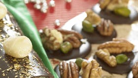 Smelt chokoladen og køl af til smørbar. Så smøres den ud i små cirkler, og der sættes en af hver af nødderne - de store i halve - på hver cirkel. Afkøles, så de stivner. Opbevares køligt.