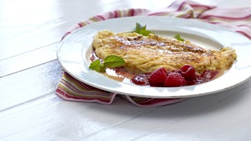 Omeletten skal være gylden men blød og svampet i midten. Læg rødgrøden i omeletten og fold den.
