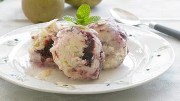 Hæld ismassen i en fryseegnet form og frys isen i 2 timer, til den er grødet i konsistensen. Blend solbærrene med vaniljekorn og smag til med sukker. Vend solbærrene i pæreisen, uden de bliver blandet helt sammen, og frys den i yderligere 2 timer. Tag isen ud 20 min. før servering, anret isen som kugler og pynt med mandelflager.
