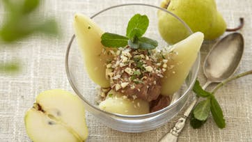 Mynteskum: Pisk kakao og vand sammen i en lille gryde. Bræk chokoladen i små stykker og smelt dem i gryden under låg ved svag varme. Afkøl chokoladen. Pisk fløden stiv og vend den i chokoladen. Anret pærer og chokolade portionsvis og pynt med hakket mynte og mandler.