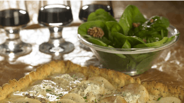 Server tærten med babyspinat smagt til med citronsaft, nøddeolie, salt, peber og valnødder. Spis tærten som efterret eller forret, eller brug den til buffet.