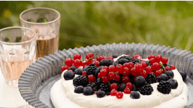 Pisk æggehviderne med citronsaft til en blød skum. Pisk sukkeret i lidt ad gangen til en meget sej marengs. Smør massen til din pavlova ud i en cirkel på ca. 20 cm i diameter på bagepapir. Bag ved 100º varmluft i ca. 1 time, til overfladen er helt tør, og marengsen stadig er helt hvid. Afkøl din pavlova på bagerist. Pisk fløden til en fast skum, men pas på ikke at overpiske den. Læg flødeskummen på marengsbunden, fordel syltetøjet over og top med skyllede, nippede sensommerbær som brombær, blåbær og ribs.