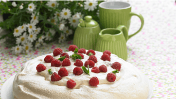 Pisk sukkerblandingen i hviderne lidt ad gangen og pisk, til hviderne er seje og skinnende, ca. 3 min. Fordel hviderne i en 26 cm cirkel på en plade beklædt med bagepapir og lav en lille fordybning fra midten og ud, så der dannes en form for kant.