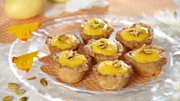 Blend pistacienødderne på en foodprocessor, tag lidt fra til pynt, kom mel, flormelis, salt og smør i. Saml dejen på maskinen med lidt sammenpisket æg, der tilsættes lidt ad gangen, til dejen sætter sig. Lad den hvile 30 min. koldt. Smør små linseforme. Rul dejen ud og beklæd formene med dejen. Sæt en form over, så dejen holdes i pres. Sæt dem i fryseren i 30 min. Bag dem 15 min. ved 180º. Tag overdelen af og bag dem i yderligere 5-10 min. Tag dem ud af formene og afkøl dem på en rist.