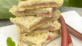 Bland smør og mel til en ensartet dej og rul den ud mellem to stykker bagepapir i 3 mm tykkelse. Bag bunden ved 175° i 15 min. og lad den afkøle. Skyl rabarberne, skær dem i 1 cm store stykker og læg dem i et ovnfast fad. Drys sukkeret over, dæk fadet med stanniol og bag rabarberne ved 175° i 45 min. Bland mel og rørsukker og hak smørret i til en usammenhængende smuldredej. Fordel rabarberne over den bagte bund og dæk med smuldredejen. Bag i yderligere 30 min. ved 175°, til den er gylden, og lad den afkøle helt. Skær den kolde kage ud i firkanter og server.