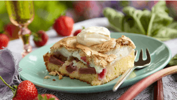 Læg bagepapir i en bradepande på 30 x 40 cm. Hæld dejen i og drys rabarberne over.