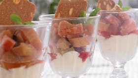Kom mindre stykker af rabarber i et ovnfast fad. Drys med sukker, læg alufolie over og stil i ovnen ved 200° i ca. 10 min. til rabarberne er bløde, men stadig har form. Afkøl helt.