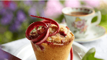 Rør smør og sukker blødt og rør æggene i et ad gangen. Riv appelsinskal og marcipan og rør det i dejen sammen med mel og bagepulver. Fordel den i 12-14 muffinsforme. Bland rabarber, sukker og hakket chokolade og drys blandingen over dejen. Bag kagerne ved 175° på midterrillen ca. 30 min. Lad dem køle på en rist. Pynt: Skræl 1-2 rabarber tyndt med kartoffelskræller og vend strimlerne i sukker.