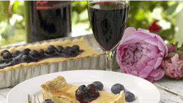Blend mel, sukker og smør til en smuldret dej, der samles med koldt vand, lægges koldt, rulles ud og kommes i en smurt tærteform og bages ved 200° med et falsk fyld af bagepapir og tørrede ærter i 15 min. Så tages det falske fyld ud og bunden bages videre i 10 min. til, stadig ved 200°. Blend så alle ingredienser til fyld og kom dem i den forbagte bund og bag ved 170° i 30 min. Kom vanilje og sukker i en gryde med 112 dl vand og kog sammen, til det laver store, seje bobler. Kom blåbærrene i og lad det koge 1 min. Jævn evt. lagen, så den er mere sirupsagtig. Hæld den afkølede lage over den lune tærte og server.