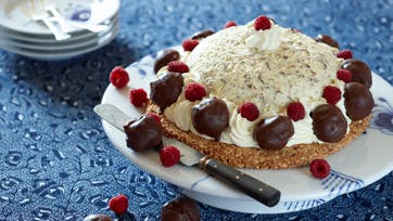 Kagebund: Blend mandlerne, bland dem med rasp og sukker. Pisk æggehviderne meget stive og vend mandelmassen i. Spred den ud på bagepapir til en cirkel på ca. 24 cm diameter. Bag den i 20 min. ved 175°. Lad den køle af på en bagerist.