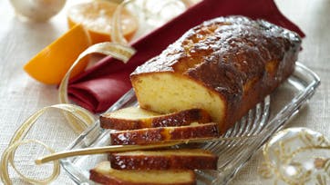 Kog appelsinsaft og sukker sammen uden låg, til det er blevet sirupsagtigt. Kom kagen tilbage i formen og prik den med en gaffel. Hæld appelsinsaften over og lad kagen stå i formen, til appelsinsaften er trukket helt ind.