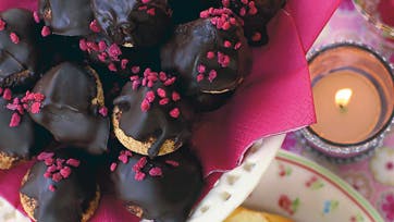 Pynt med frysetørrede hindbær eller kandiserede violer - eller måske spiseligt guldstøv.